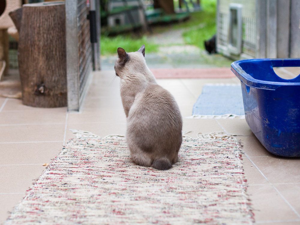 Ich denke mir: "Oh, Minou sitzt sehr fotogen da. Wenn sie jetzt noch den Kopf nach hinten dreht, bekomme ich ein sehr schönes Bild von ihr." Ich gehe also in die Hocke, um den perfekten Moment nicht zu verpassen.